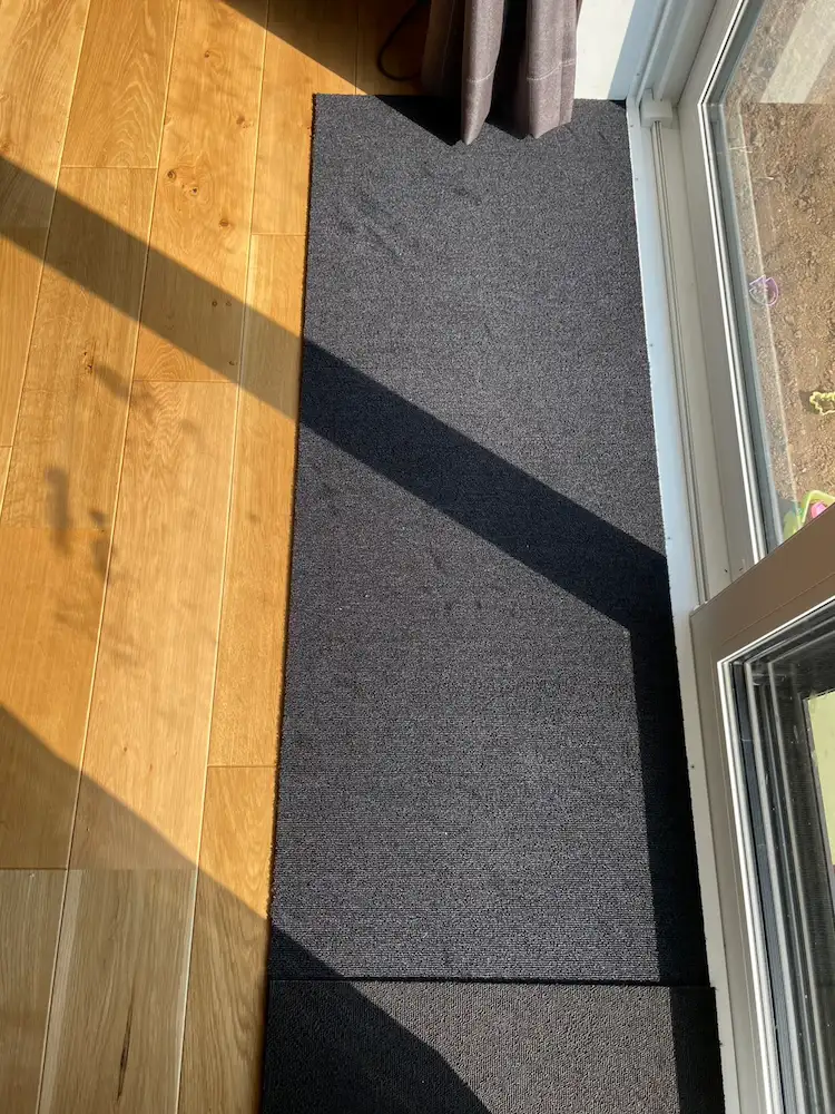 さらに我が家では窓際に黒いタイルカーペットを敷き詰めて少しでも発熱して暖が取れるように工夫をしています。この黒いタイルカーペットの上で寝転びながらの日光浴は最高です。