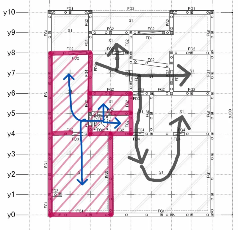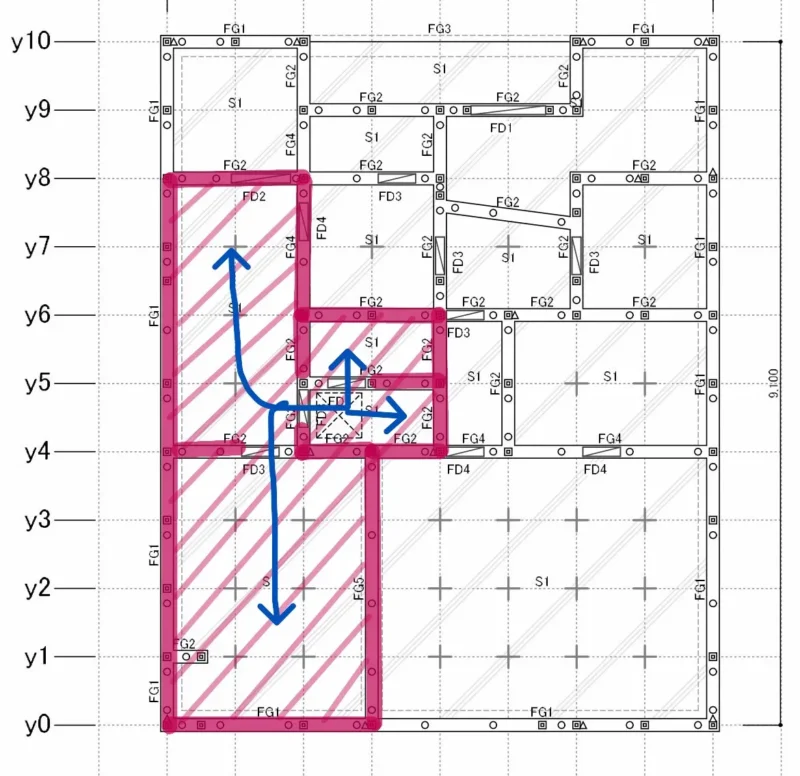 床下図面に今回の調査範囲を反映するとこのようになる。